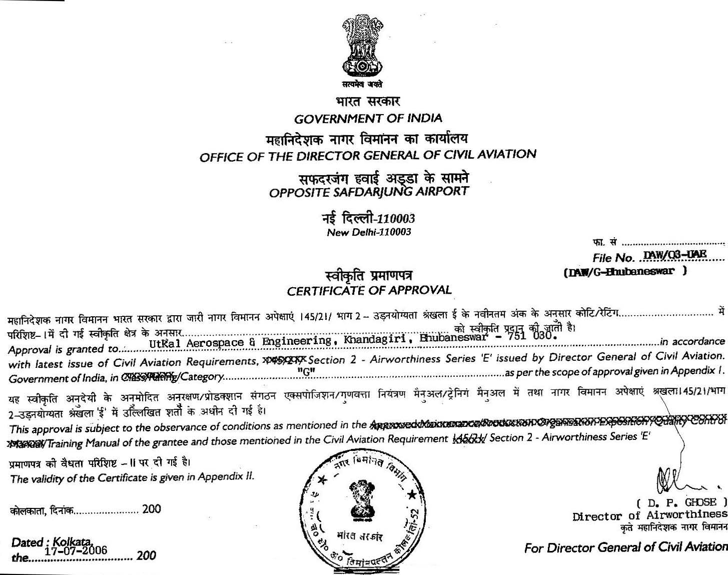 Utkal Aerospace & Engineering is purely a Technical Institute.It is approved by Director General of Civil Aviation, (Govt. of India) for Three Years course in Aircraft Maintenance Engineering at Bhubneshwar center.